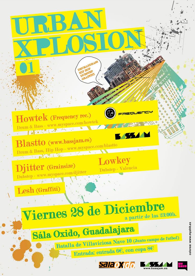 El próximo Viernes 28 de Diciembre se celebra en Guadalajara la primera Urban Xplosion, fiesta que reunirá sonidos como el dubstep, hip hop y drum and bass. También habrá una exhibición de graffiti a cargo de Lesh. El lugar escogido es la Sala Oxido de Guadalajara y el cartel será el siguiente: