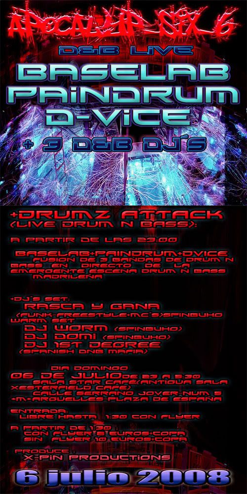 Mantisse me informa de la fiesta que hay este domingo en la sala Xesterfield Cafe hay una fiesta de dnb con 3 bandas en directo de dnb y 3 djs.Drumz attack: fusión de 3 bandas de dnb en directo:
